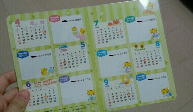 切手と一緒にこちらも頂きました。娘の名前が印刷され毎月、14日のところがマークされています。母子手帳にジャストサイズ。