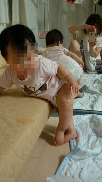 まあ、つかまり立ちと言っても、低い台でのつかまり立ち(台が低いから体がななめになってる)ですが…。私が横になると、私を台にしてつかまり立ちしようとするんで、痛くて仕方ありません。小さな手のひらで9キロ近い力を加えてくるので、痛さが鋭利!痛い!痛い!と思って朝起きます。そんな感じなので、寝ている人を乗り越えるなんてお茶の子サイサイです。迷惑な女!!(笑)