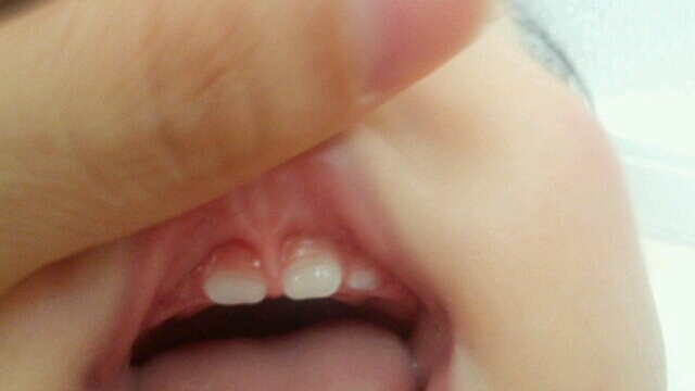 で、さっき二人でじゃれてゴロゴロしてたら上の向かって右の歯が新しく生えてきてるのを発見。で、すかさず写真。