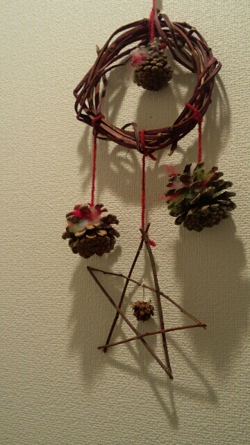 児童館でクリスマスのオーナメントをこしらえてきました。児童館の畑のサツマイモのツルと、そこらへんに落ちている松ぼっくりとかを使いました。ドングリとかもいいかもねー。かわいいっ。