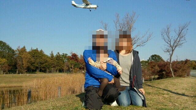 ベビーカーに携帯を置いてタイマーで撮ろうとしたら、飛行機が帰ってきて奇跡的に写りこんだ。ちょっと嬉しい!