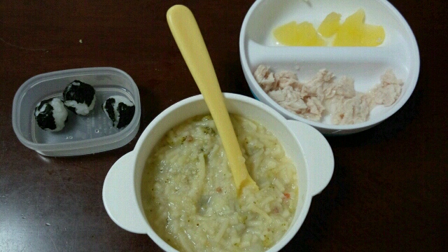 で、さすがにお粥のつかみ食べが汚れすぎて泣けてきたので、軟飯を小さいおにぎり(10g弱くらいかね?)をラップで握ってみたら、食べたし被害も少なかった。最終的にはやっぱりポイポイ投げるんだけど。