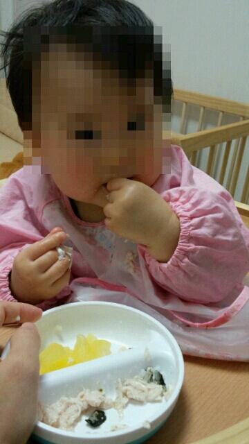 味の薄い(つーか味のない)おかずも、スプーンだと嫌がるから、てっきり「あー、ついにガッツリ味付けなきゃダメな時が来たか…」と諦めかけたのですが、つかみ食べさせると味なくても食べました。あ、そーゆーことだったの、セーフ、セーフ。
