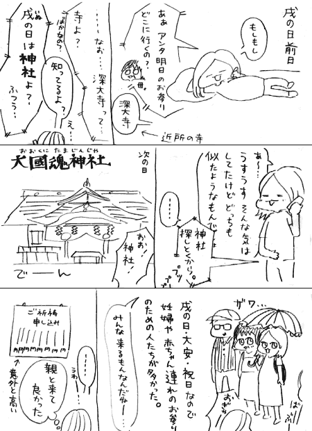 暦には12日間に一度「戌の日」という日があるらしく、犬は安産だから縁起をかついで安定期入った後その日に祈願しに行く