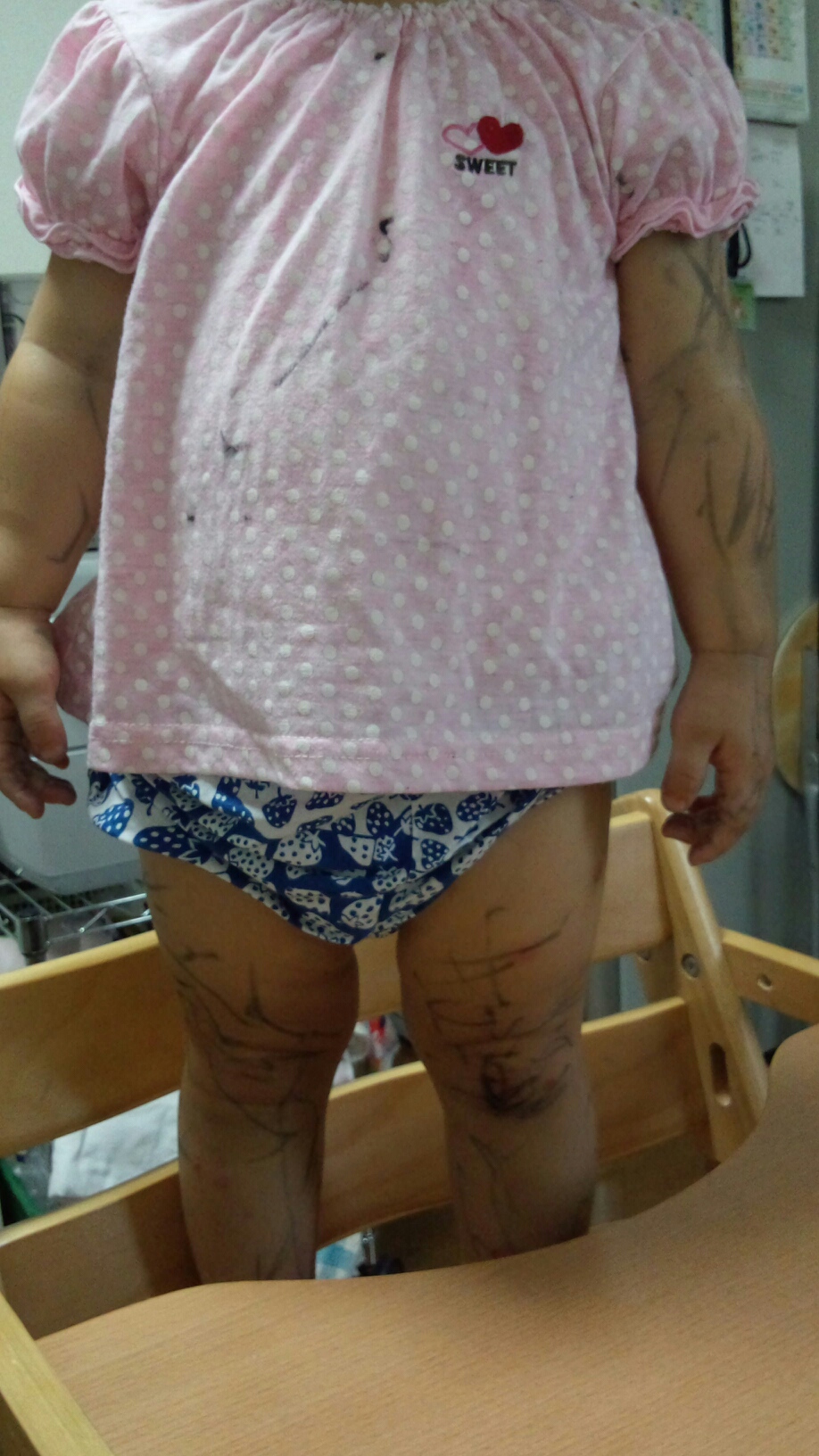ペンを取り出し寝室で遊んでいたみたいで、布団やカーテンにも書いていたし、壁も黒ずみ、インクがシーツにこすれ、etc