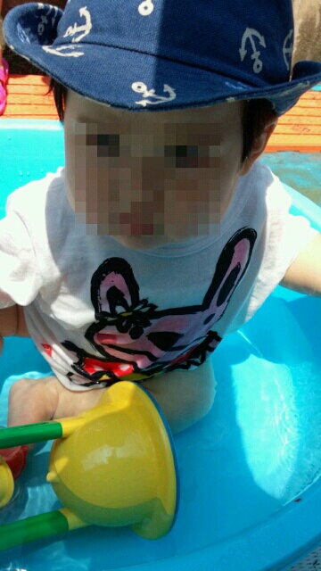 今日は午前中は児童館でプール(という名の水遊び)があったので行ってきました。プラスチックプール2台、ビニールプール3台、タライ数個用意されていて、水遊び用オモチャもありました。赤ちゃんから幼児までが参加していて、一人で座れることが条件でした。水着じゃなくても良いとのことで、ロンパースにTシャツ着せて入らせました。水遊び用紙パンツは衛生上NGだそうです。
