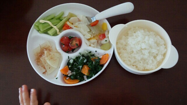 食べられそうなものは具体的には茹でたブロッコリー、コーンフレーク、プチトマト、茹でた枝豆、つぶコーン、あと(味は大人用だけど)フライドポテトもあったし、ご飯(雑穀米ブレンドかな?)、カレー、ヨーグルトも。